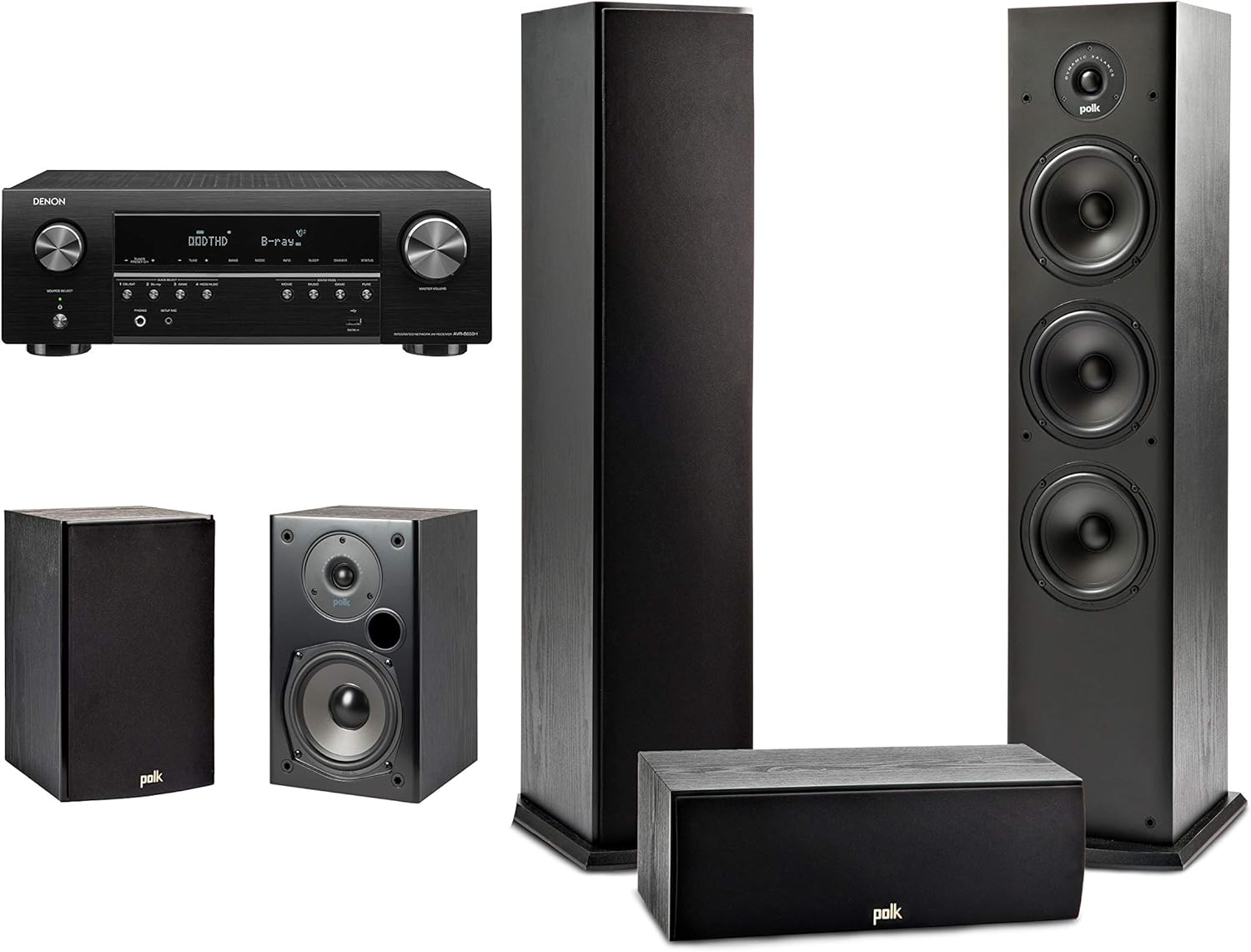 Amazon Com Polk Audio T Series 5 Channel Complete Home Theater System Denon Avr S650h Receiver Two 2 T15 Bookshelf One 1 T30 Center Channel Two 2 T50 Tower Speakers Wi Fi